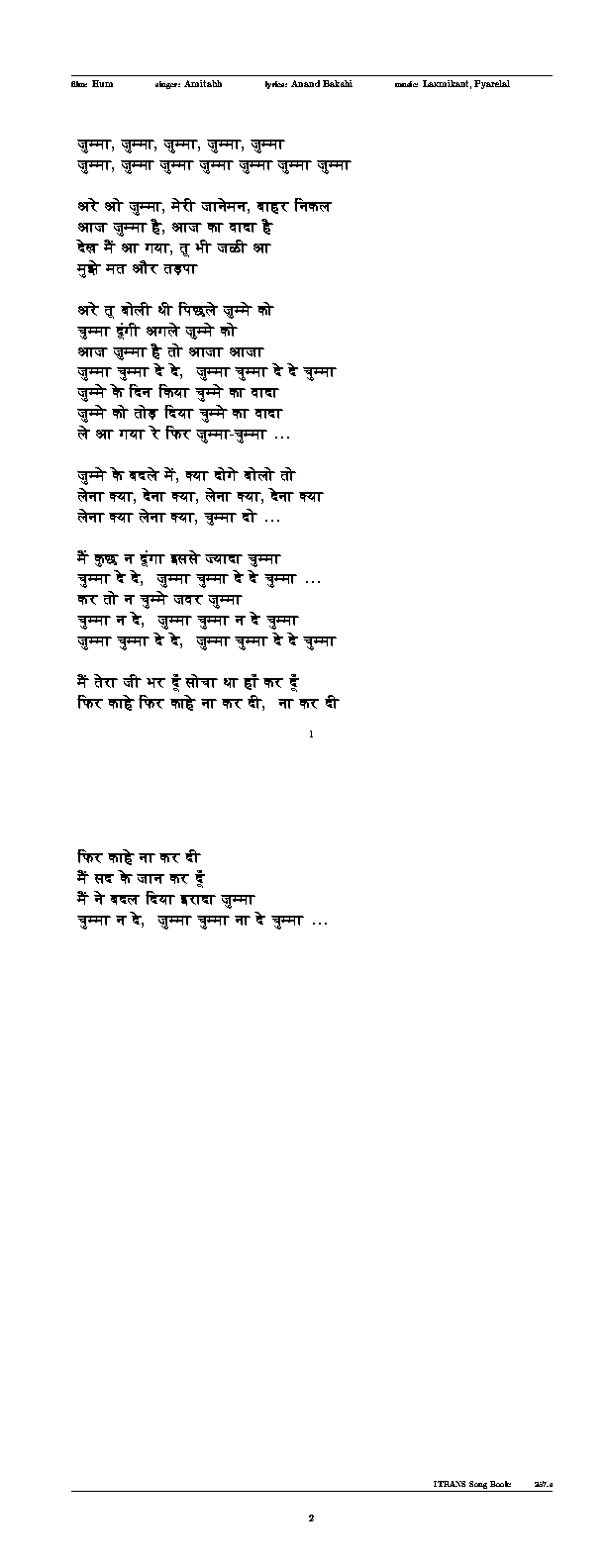 Jumma Chumma Lyrics In English / Jumme ke din kiya jumme ka vaada jumme ko tod diya jumme ka vaada le aa gaya re phir jumma jumma chumma de de.